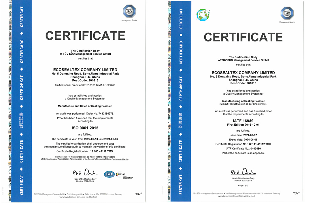 In order to improve product quality and strengthen the market competitiveness of enterprises. ecoSealTex passed the TUV review and updated the ISO9001 and IATF16949 certificates in June 2022.
