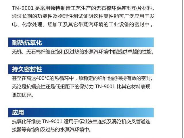 TN-9001是采用獨特制造工藝生產(chǎn)的無石棉環(huán)保密封墊片材料,通過長期的功能性與物理性測試證明這種高性能可廣泛應(yīng)用于發(fā)電、化學(xué)處理、烴加工及其它蒸汽環(huán)境的工業(yè)設(shè)備的密封中。
