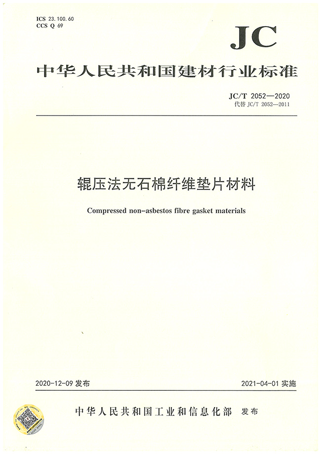 JC/T 2052-2020《輥壓法無石棉纖維墊片材料》標準的第三起草單位。